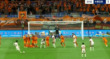 比赛的第31分钟,张华晨主罚禁区前任意球右脚劲射,球击中横梁下沿之后反弹入网,1比0!