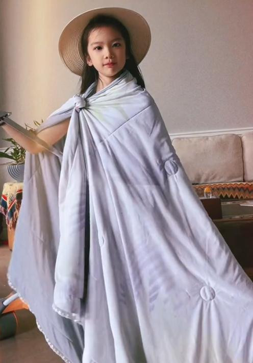 在七夕那天她发了女儿头戴遮阳帽,身披空调被,手持道具剑的视频。