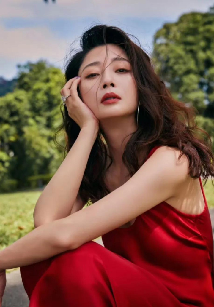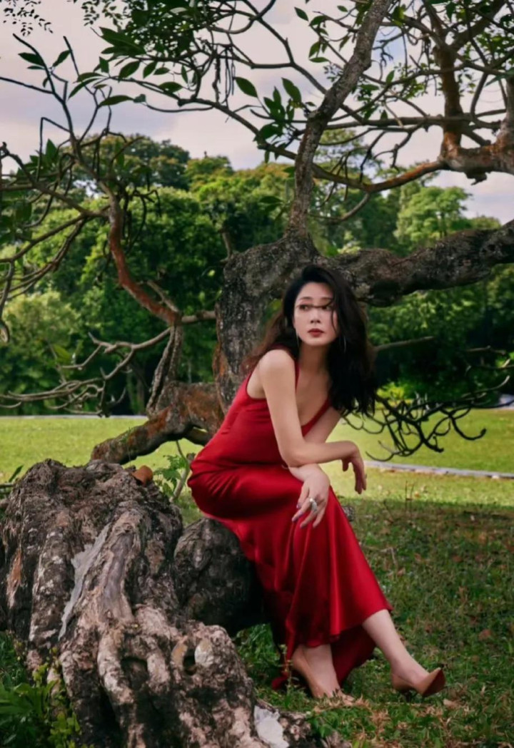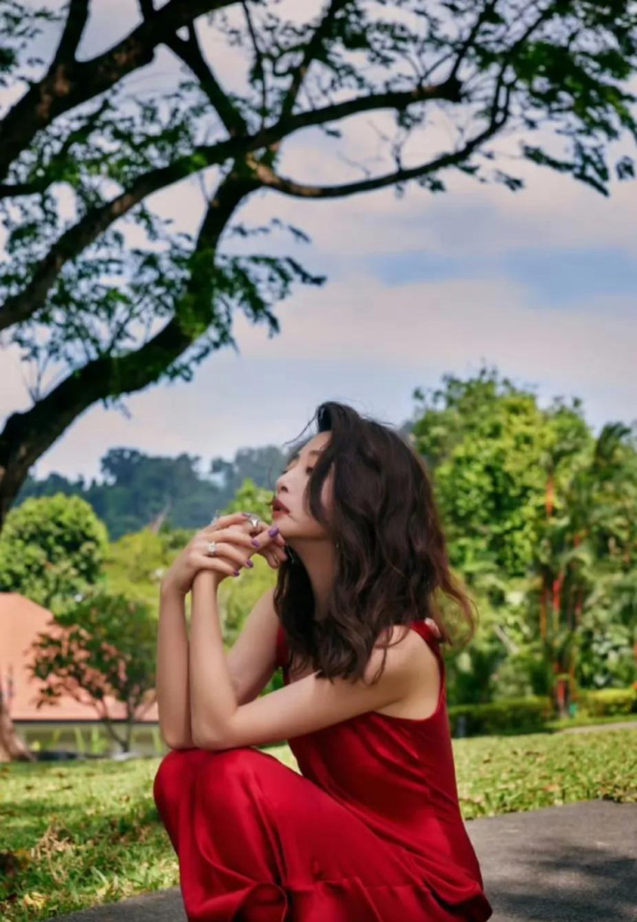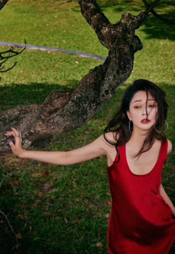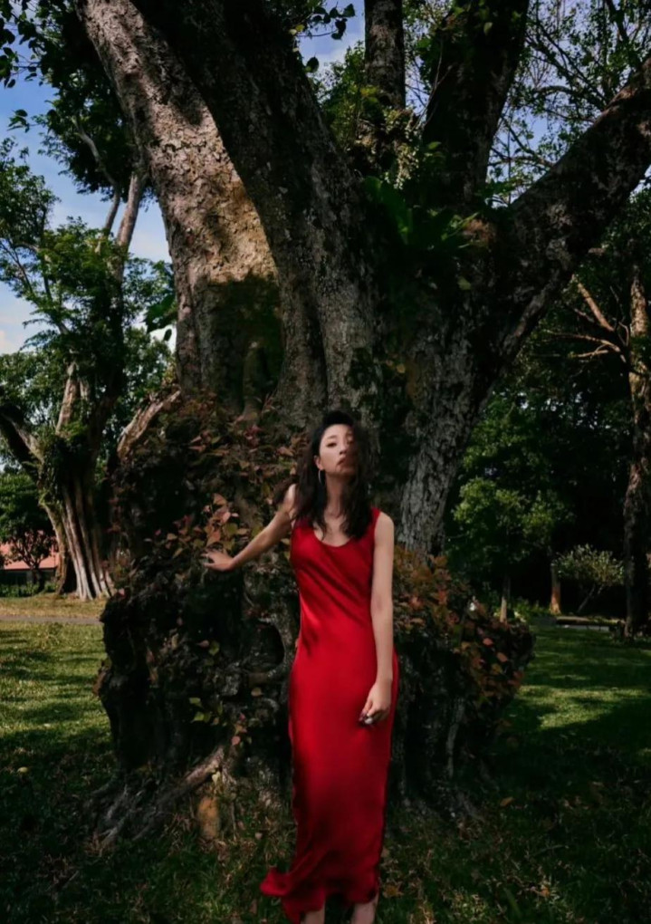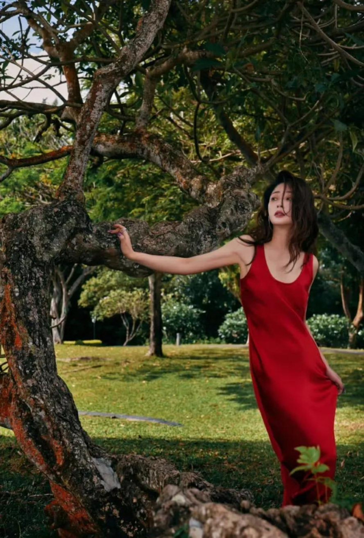 殷桃在树下穿着红衣拍照, 让人联想到樱桃, 太有趣了