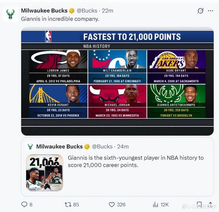 21000分之夜结束7连败! 扬尼斯19分钟29+8早早打卡 雄鹿官方祝贺